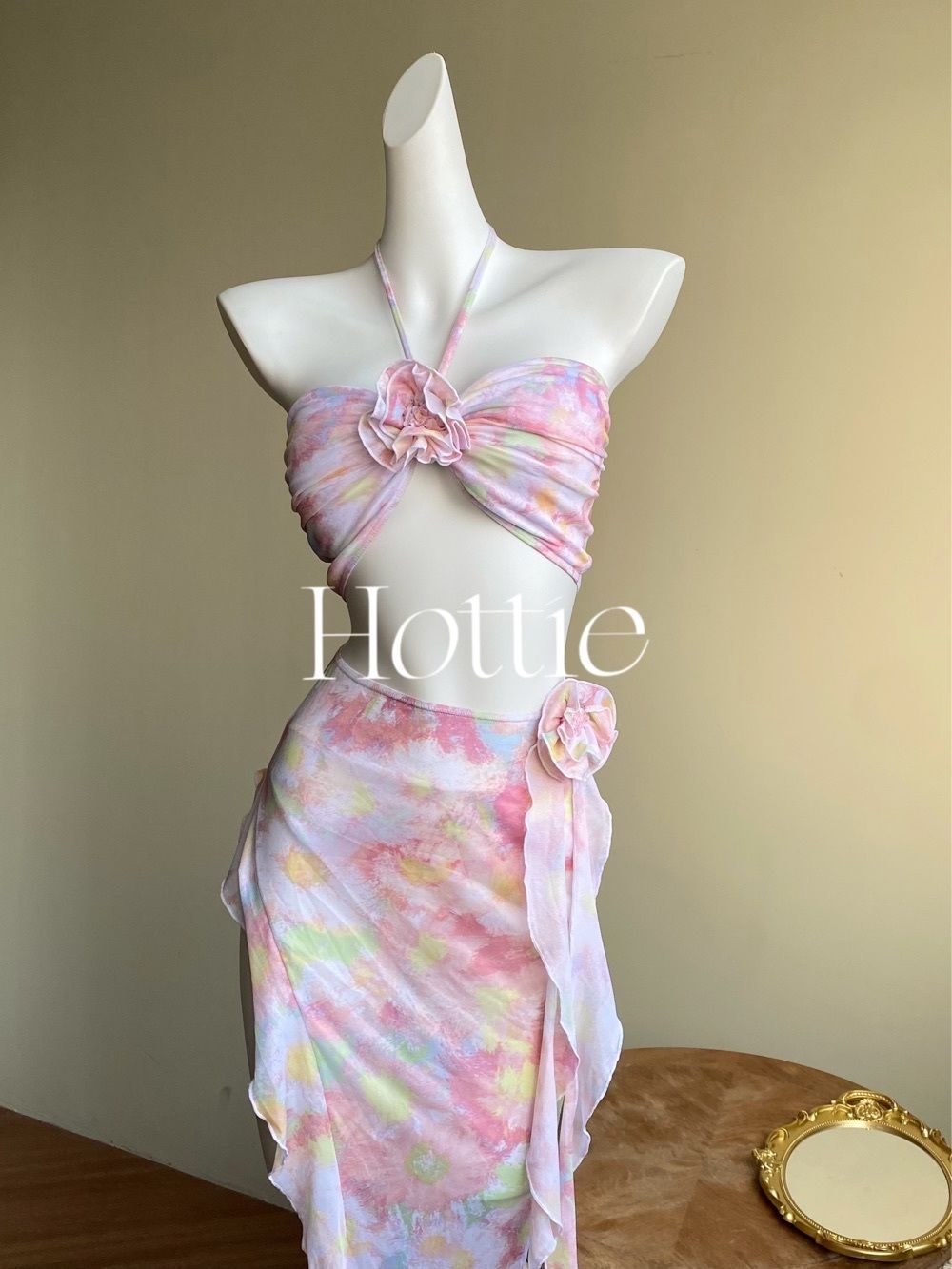 Ladies Pink Floral Bikini Two-Piece Swimsuit Three-Piece Set